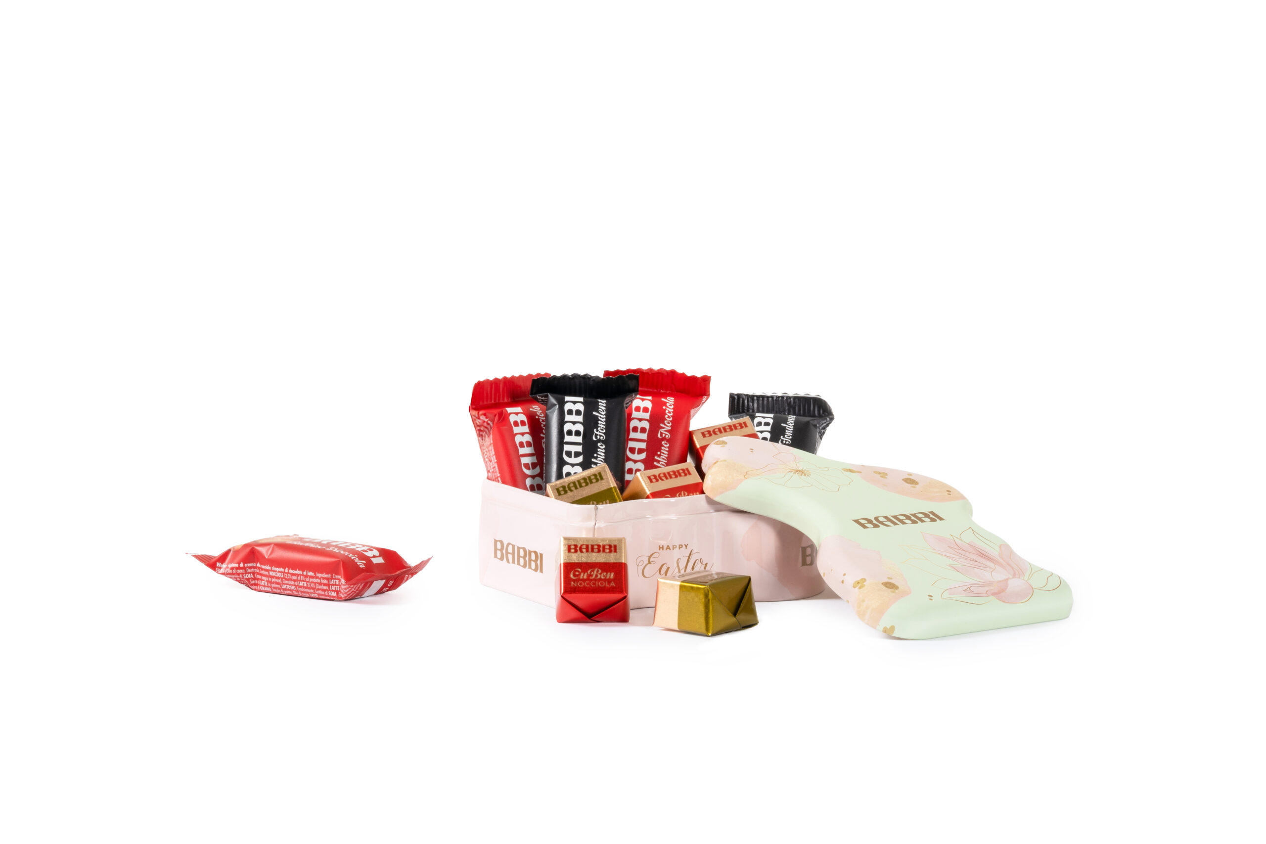Coniglietto di latta con all’interno wafer e cioccolatini Babbi